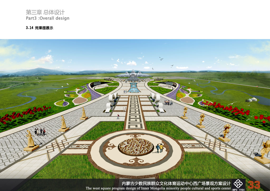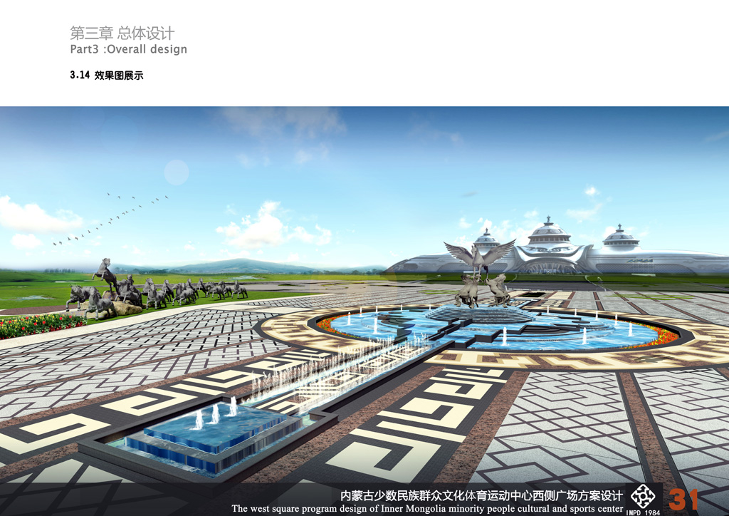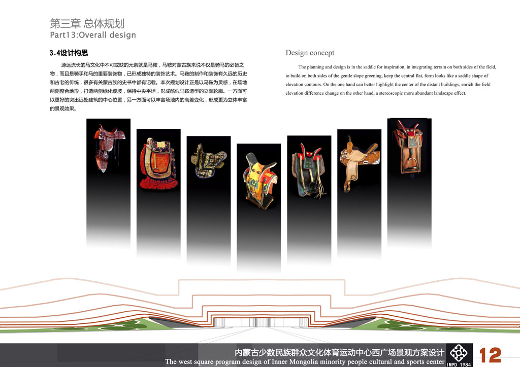 設(shè)計(jì)《馬背之魂》的靈感來(lái)源于馬鞍,馬鞍被草原人民譽(yù)為孕育民族搖籃的吉祥物。整個(gè)廣場(chǎng)景觀被設(shè)計(jì)為馬鞍型,場(chǎng)地兩側(cè)和中央入口景觀軸是鞍橋、鞍墊、夾墊、鞍韂和腳蹬,展示出草原“馬背之魂”的氣勢(shì)和氣魄,寓意自治區(qū)及全區(qū)人民吉祥如意。同時(shí),場(chǎng)地入口處設(shè)計(jì)了馬頭琴造型,兩側(cè)是哈達(dá)及迎賓歌舞等雕塑,表達(dá)出草原人民熱情好客的情懷;會(huì)場(chǎng)周邊是“馬圖騰” 和“萬(wàn)馬奔騰”群雕,進(jìn)一步突出蒙古族豐富多彩的“馬文化”。
