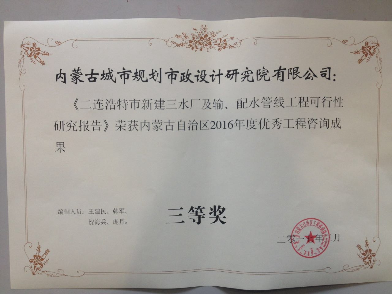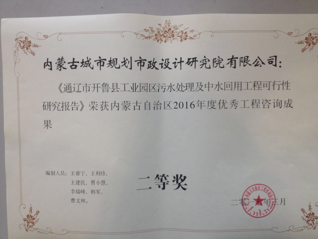自治區(qū)2016年度優(yōu)秀咨詢成果獎(jiǎng)名單揭曉,我院市政一所設(shè)計(jì)的《通遼市開魯縣工業(yè)園區(qū)污水處理及中水回用工程》、《二連浩特市新建三水廠及輸、配水管線工程可行性研究報(bào)告》分別榮獲內(nèi)蒙古自治區(qū)優(yōu)秀工程咨成果二、三等獎(jiǎng)。