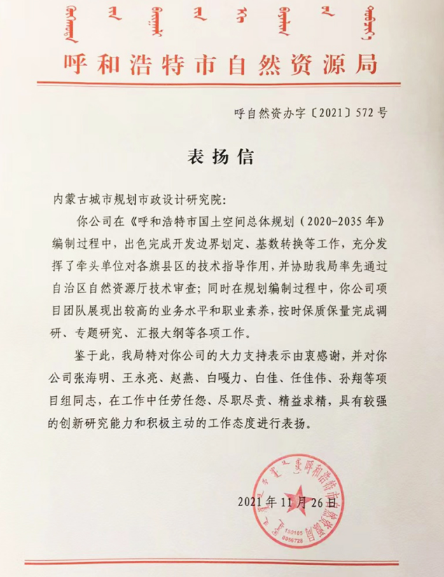 近日,呼和浩特市自然資源局向我院發(fā)來表揚(yáng)信,對(duì)我院參與編制《呼和浩特市國土空間總體規(guī)劃(2020-2035年)》項(xiàng)目組成員展現(xiàn)出的較高業(yè)務(wù)水平和職業(yè)素養(yǎng)給予充分肯定和表揚(yáng)。
