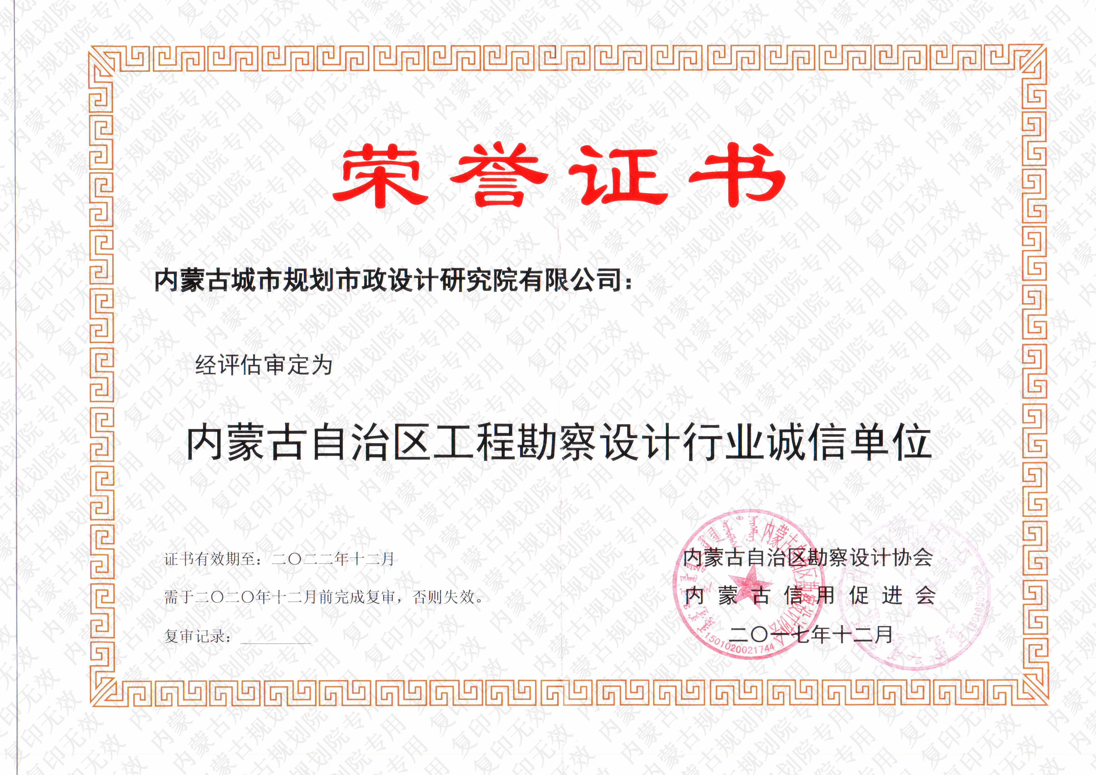 內蒙古自治區(qū)工程勘察設計行業(yè)誠信單位